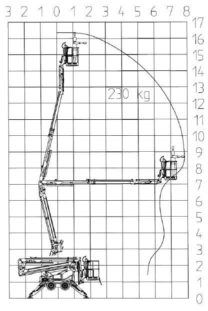 As Leguan 165 can be operated with maximum platform capacity over the whole lifting area, the construction of the machine is considerably more straight forward. This increases user friendliness also, because the operator doesn’t have to worry about different platform capacities with different outreaches of the booms.